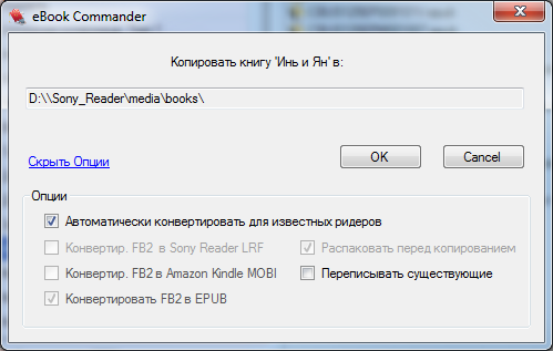 Конвертация книги в нужный формат производится автоматически при копировании: